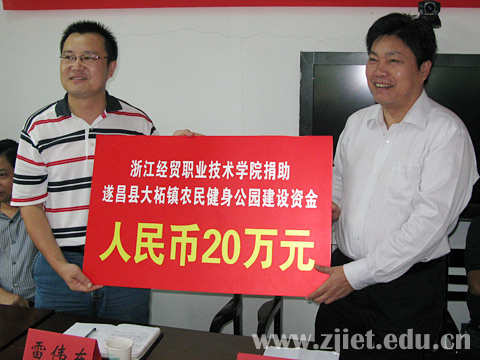 9月26日上午,童书记出席我院资助大柘镇农民健身公园建设项目活动。大柘镇是遂昌县中西部的交通枢纽,是西部四镇六乡和遂昌主要景区的必经之路。随着社会经济的发展,大柘镇的集镇面貌有了很大的改善,然而位于大柘镇三角坛一带脏、乱、差与城镇发展极不相符,成为制约大柘城镇建设一大瓶颈,同时也影响“长三角休闲旅游名城”建设。学院领导得知大柘镇将在三角坛建设农民健身公园时,结合“创先争优”活动的开展,在党员干部中募集捐款6.8万,连同学院捐资共计人民币20万元,资助大柘镇农民健身公园建设。在捐赠仪式上童学敏书记和县政协副主席包志华作了讲话。
